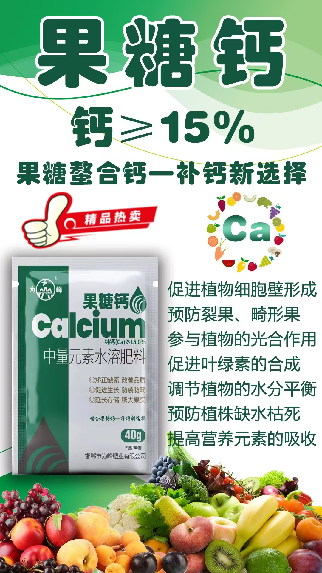 為峰肥業(yè)果糖螯合鈣—不僅僅是補鈣純鈣(Ca)≥15.0%中量元素水溶肥料促進植物細胞壁形成預(yù)防裂果、畸形果參與植物的光合作用促進葉綠素的合成調(diào)節(jié)植物的水分平衡預(yù)防植株缺水枯死提高營養(yǎng)元素的吸收
